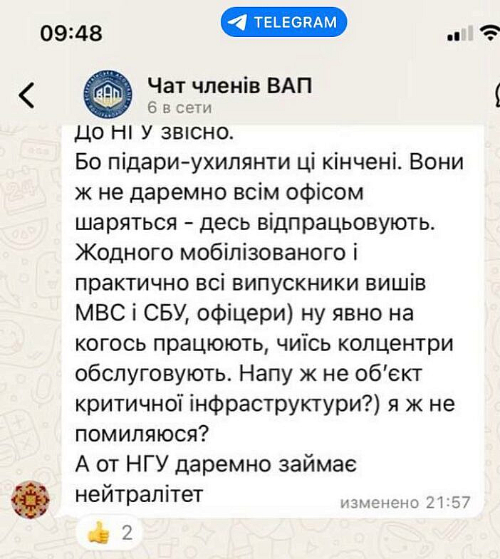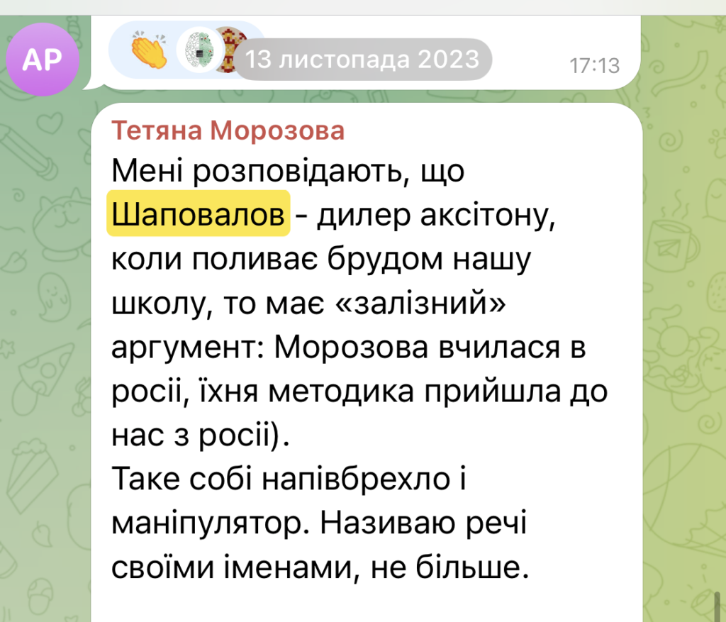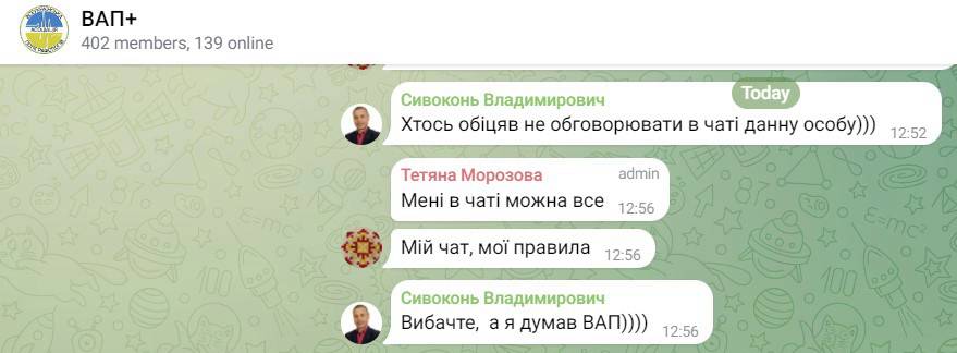 Вона на публічних площадках, в чатах, в спілкуванні з державними та правоохоронними органами постійно принижує, дискредитує, вдається до нецензурної лайки та висловів, які етично несумісні з високим званням доктора наук та очільниці професійної спільноти.