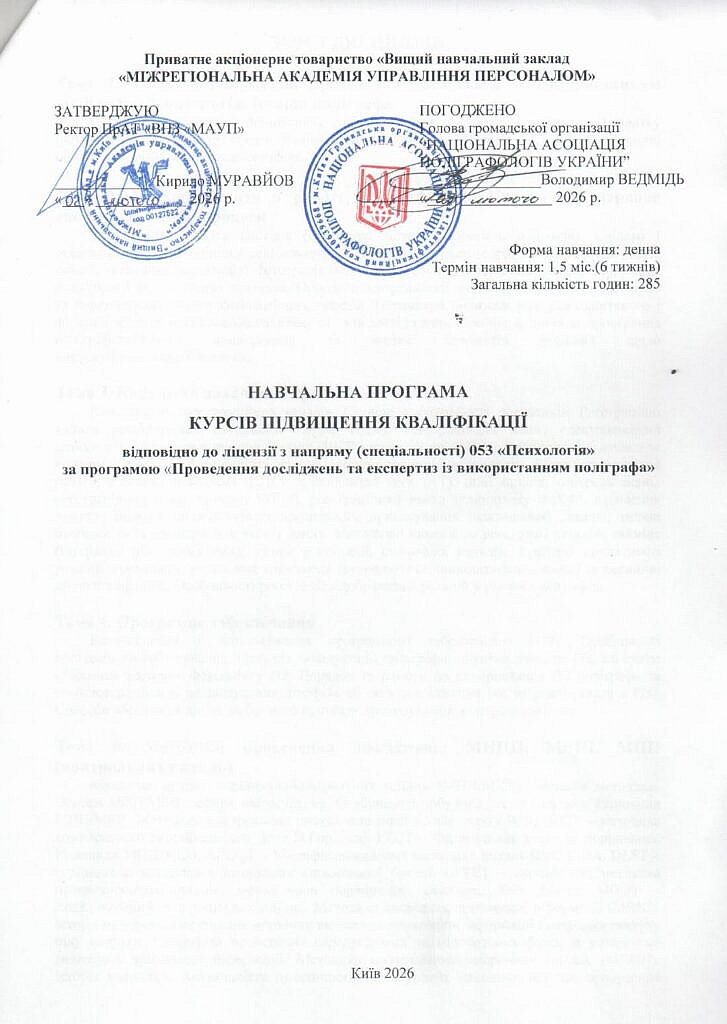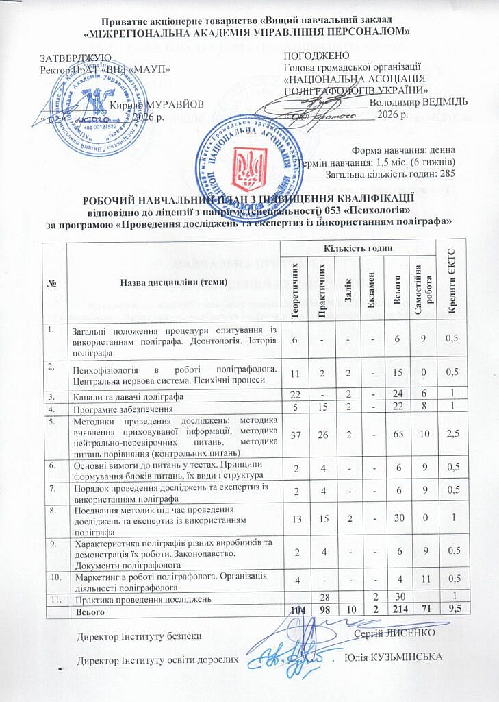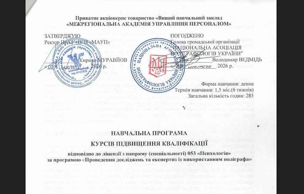 Міжрегіональна Академія управління персоналом та Національна асоціація поліграфологів України оновили навчальну програму з підготовки поліграфологів відповідно до вимог професійного стандарту «Поліграфолог», який був затверджений 24 грудня 2025 року та внесений до Реєстру кваліфікацій 6 січня 2026 року за кодом професії 2490.