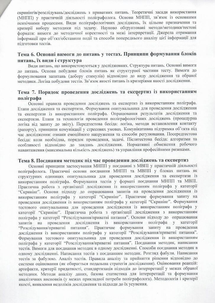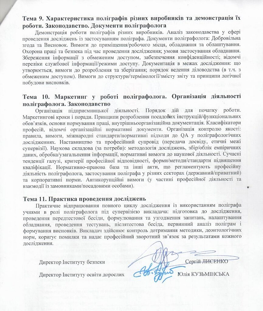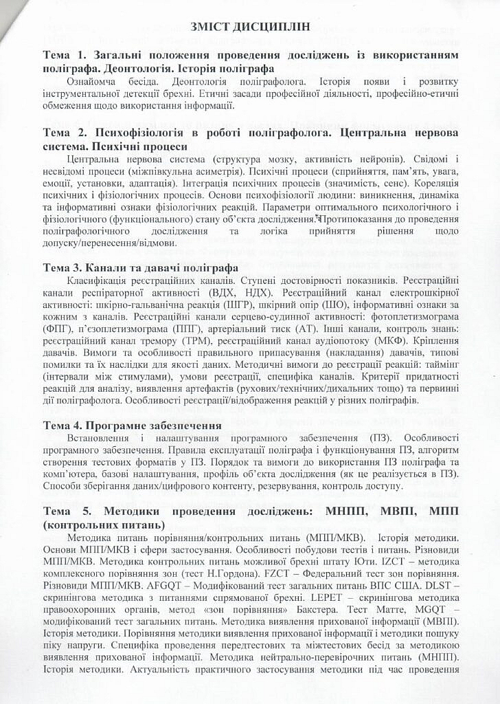 Таким чином, оновлена програма МАУП та НАПУ відповідає не лише формальним вимогам професійного стандарту «Поліграфолог», а й фактичному запиту професії на глибоку, багатометодну, технічно різносторонню та максимально практичну підготовку. Великий обсяг годин, викладання трьох провідних методик, навчання на трьох поліграфах та практика реальних тестів формують саме той рівень підготовки, який сьогодні потрібен майбутньому поліграфологу для професійного старту та подальшого розвитку.