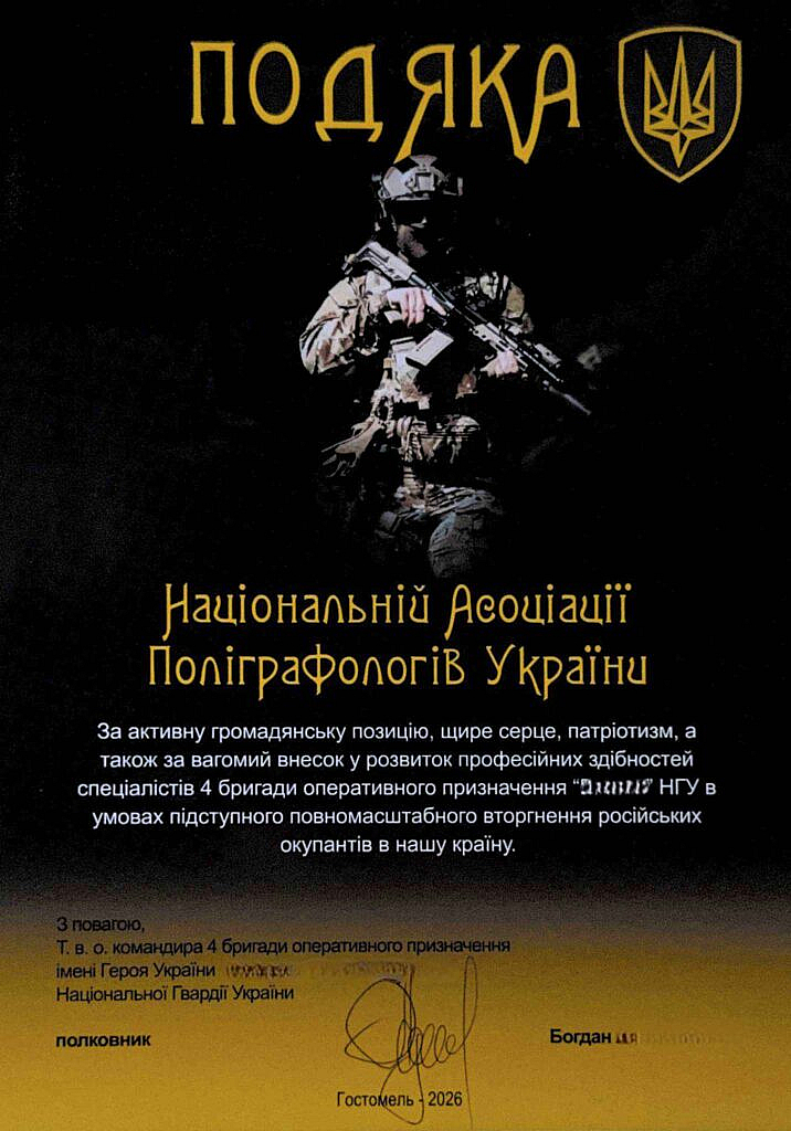 Національна асоціація поліграфологів України (НАПУ) отримала офіційну подяку від бригади оперативного призначення Національної гвардії України за підготовку фахівців у сфері поліграфології та профайлінгу в умовах повномасштабного вторгнення російських окупантів.