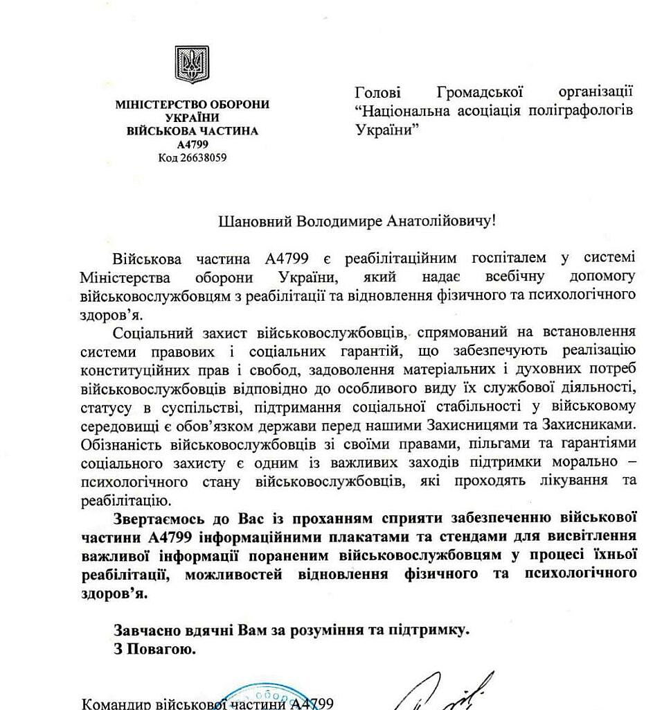 До Національної асоціації поліграфологів України (НАПУ) надійшов офіційний лист від військової частини А4799 Міністерства оборони України з проханням про допомогу в організації збору коштів для реабілітації та відновлення фізичного та психологічного стану військовослужбовців.