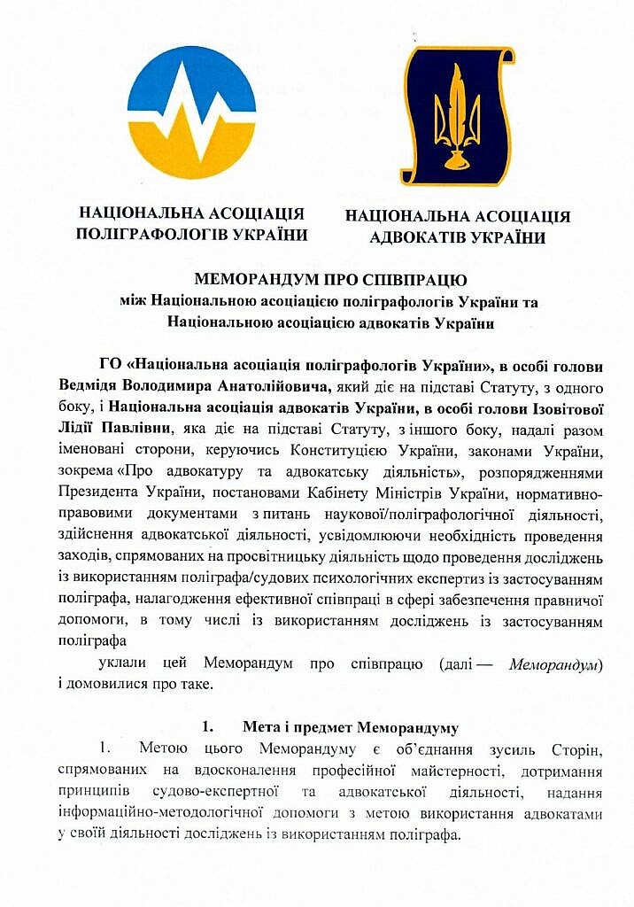 Документ засвідчує готовність сторін до тісної співпраці у питаннях впровадження сучасних методів доказування, зокрема проведення судових психологічних експертиз із застосуванням поліграфа.
