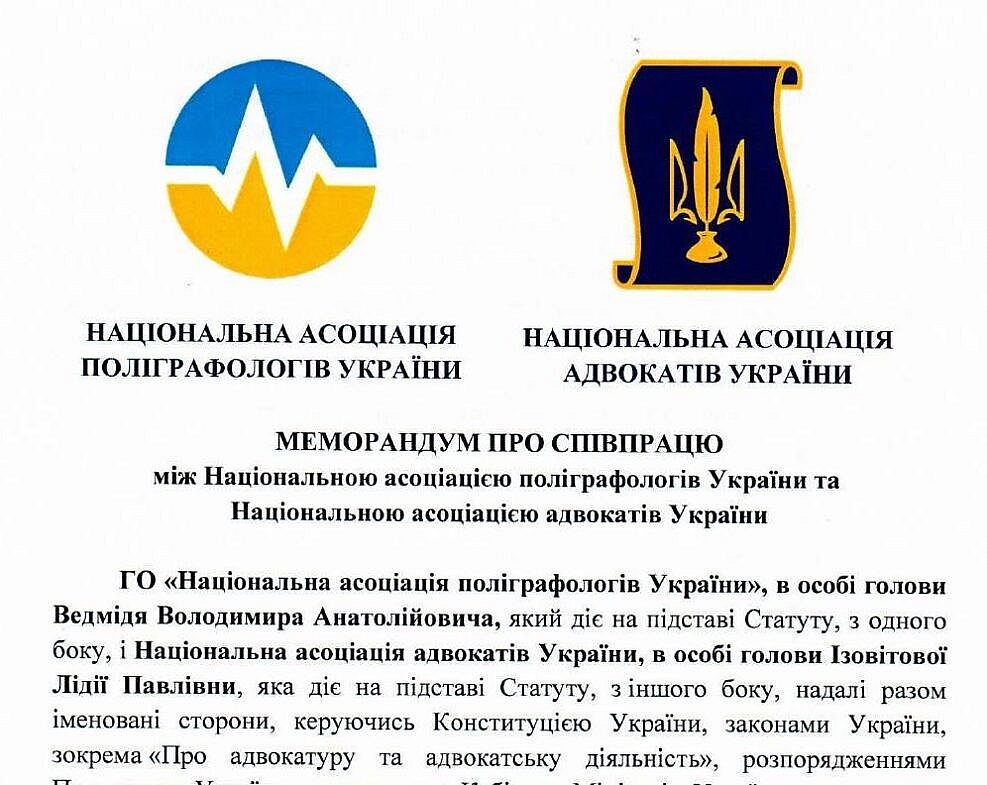Київ, 26.08.25 – Національна асоціація поліграфологів України (НАПУ) та Національна асоціація адвокатів України (НААУ) підписали Меморандум про співпрацю, який визначає стратегічні напрями взаємодії двох інституцій у сфері захисту прав і свобод людини, розвитку правової науки та розвитку застосування поліграфа в правозастосовчій практиці.