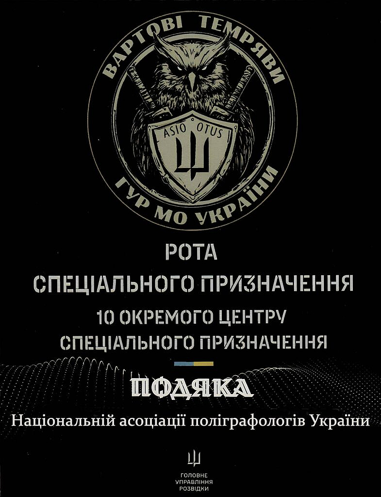 Національна асоціація поліграфологів України отримала офіційну подяку від Роти спеціального призначення «Вартові Темряви» Головного управління розвідки Міністерства оборони України.